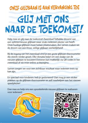 Zwembad Tolhekke droomt van een splinternieuwe glijbaan waar straks iedereen plezier van heeft. Onze huidige glijbaan moet helaas plaatsmaken, dus samen maken we de droom van een frisse, veilige glijbaan werkelijkheid!